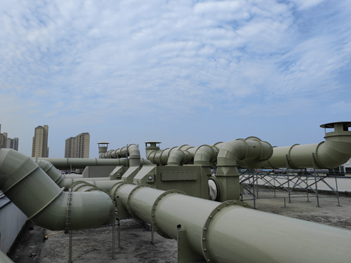 檢測室有機廢氣物 → 靈活性碳濾出器 → 引生產的風機 → 進行排放